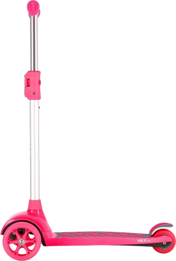 Trottinette pour enfants NILS Fun, légère et stable, idéale pour les premières sorties et l'entraînement de l'équilibre. Elle dispose de trois roues pour plus de confiance, de roues à LED pour une meilleure visibilité, d'un guidon réglable et d'un frein arrière à pédale pour un arrêt en toute sécurité.