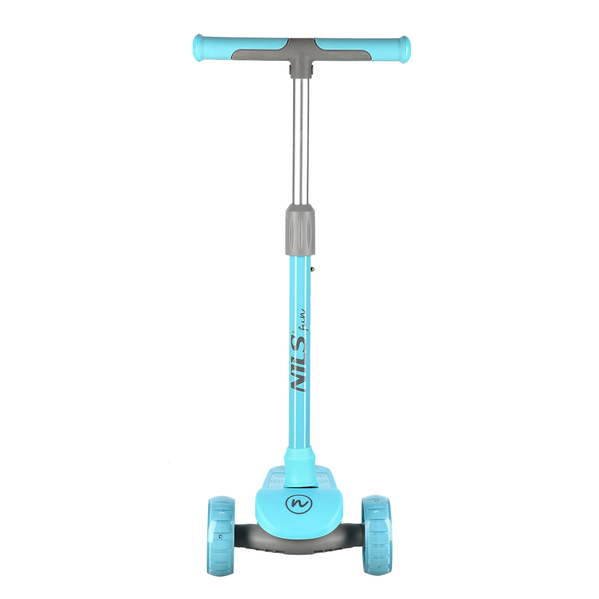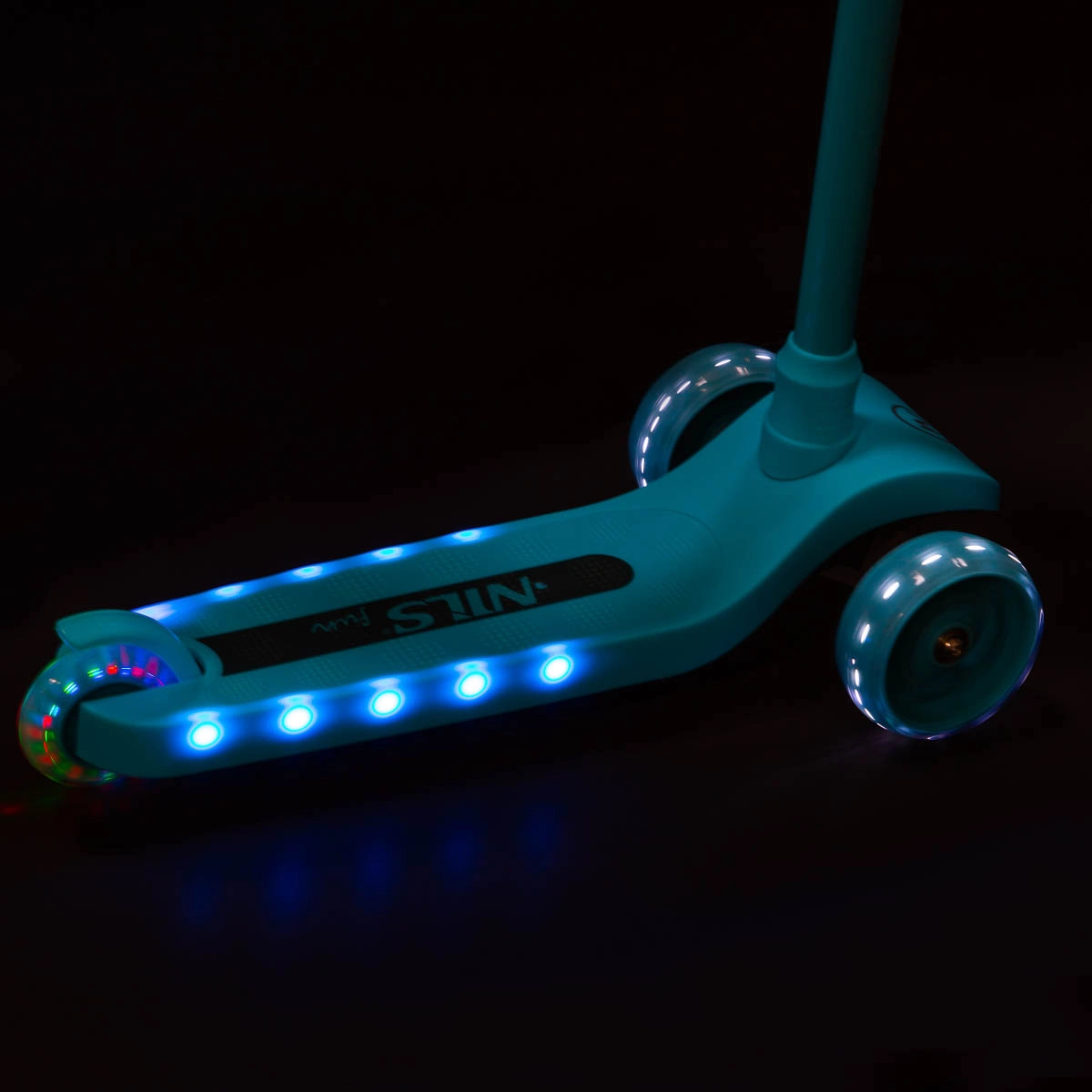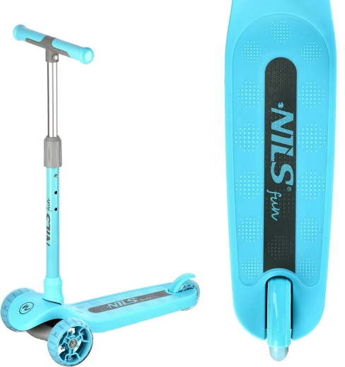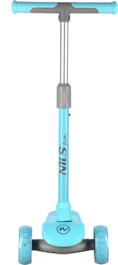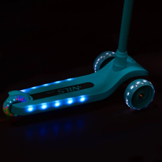 Trottinette pour enfants NILS Fun, légère et stable, avec trois roues, direction par inclinaison et guidon réglable en hauteur sur 3 positions. Elle offre des roues LED lumineuses ainsi que des flancs du plateau à LED, une surface antidérapante et un frein à pied sûr. Idéale pour les débutants sur surfaces planes.