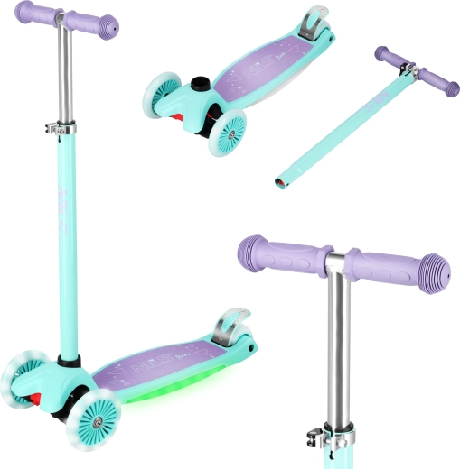 La commande est intuitive grâce à la direction par transfert de poids : en inclinant le guidon, les roues avant tournent dans la direction souhaitée. Le guidon réglable en hauteur (78 / 84 / 90 cm) et les poignées TPR confortables permettent à la trottinette d’évoluer avec l’enfant. La construction en aluminium, acier et nylon est très légère (2,46 kg) et en même temps résistante, avec une charge maximale allant jusqu’à 50 kg.