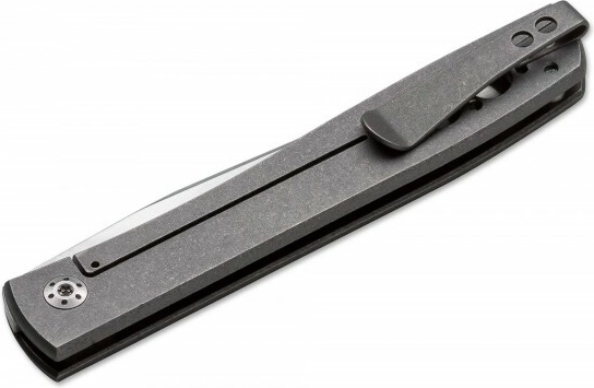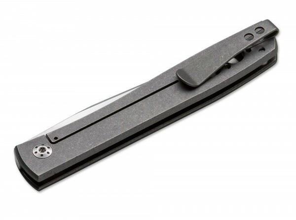 La lame s’ouvre manuellement par encoche d’ongle, sans flipper, et une fois ouverte, elle est sécurisée par le Framelock intégré au manche en titane. Les évidements d’allègement réduisent le poids et améliorent la prise, tandis que le clip de poche permet un port discret et profond.