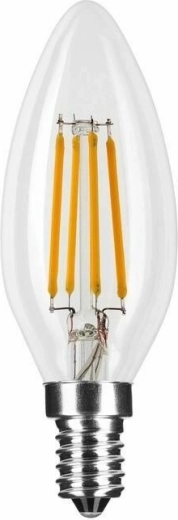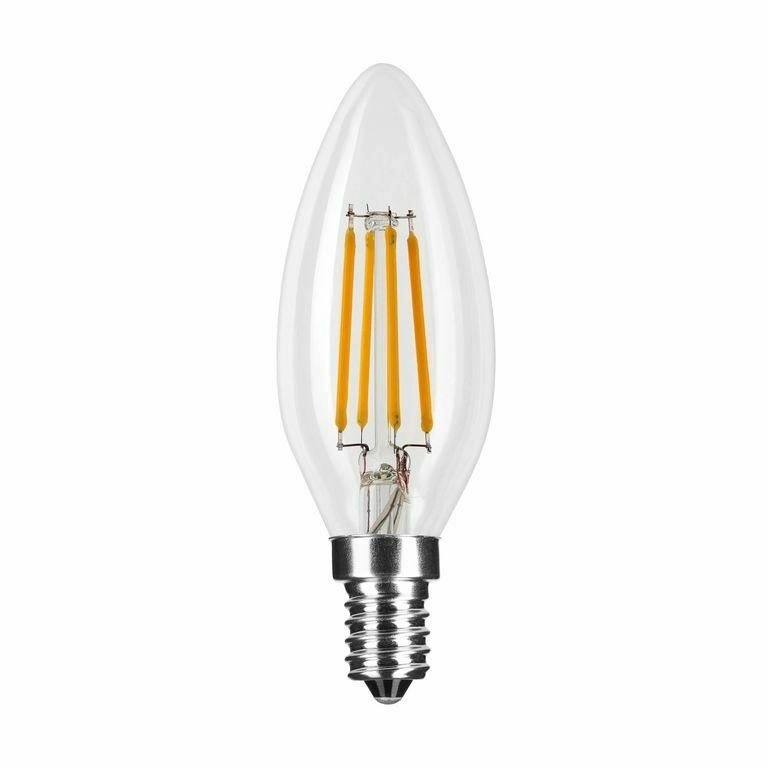 Élégante ampoule LED en forme de bougie avec culot E14 et puissance de 4 W, offrant 470 lm lumineux de lumière blanc chaud 2700 K. Grâce à la technologie filament, elle éclaire à 360°, possède une longue durée de vie de 35 000 h et une excellente efficacité pour un éclairage économique et stylé.