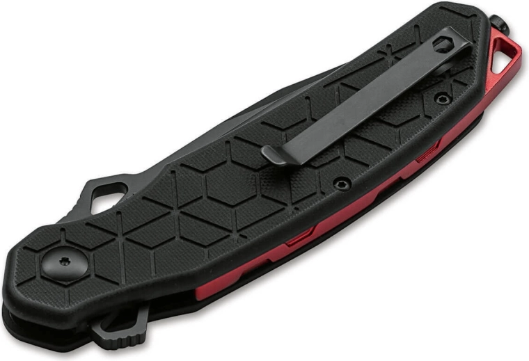 La poignée ergonomique en G10 avec une texture marquée en nid d’abeilles offre une prise sûre, même avec des gants ou par temps humide. Le design est complété par une entretoise en aluminium rouge, un trou pour cordon, un clip de poche pratique et un brise-vitre intégré pour les situations d’urgence. Le couteau est livré dans un étui en nylon de qualité, facilitant le transport et la protection de l’outil.