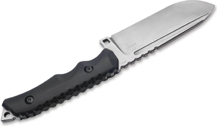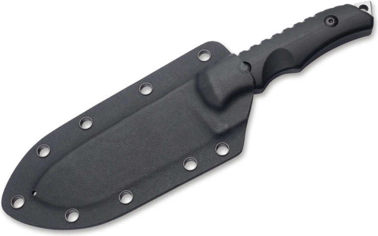La poignée texturée en G10 noir assure une prise sûre et confortable même par temps humide ou froid. Les rainures antidérapantes au niveau du repose‑pouce et à l’extrémité du manche améliorent le contrôle du couteau. Le brise‑vitre intégré et l’œillet pour cordelette étendent la fonctionnalité en situation d’urgence. L’étui Kydex fourni permet un port sécurisé et polyvalent.