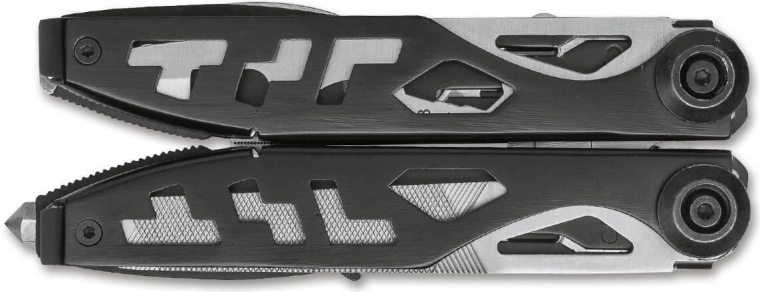 - Équipement pratique : lame partiellement dentelée, scie à bois, lime avec règle, outil multifonction avec ouvre‑boîtes et décapsuleur, plieur/dénudeur de fil et clé hexagonale.