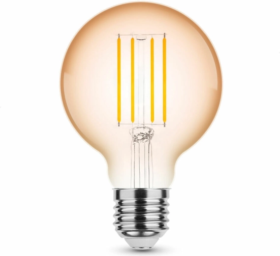 Ampoule LED élégante de forme ronde G80 avec technologie Filament et verre ambré, créant une agréable lumière blanc chaud (1800 K). Elle offre 360 lm, un angle de diffusion de 320°, un culot E27 et une puissance économique de 4 W. Idéale pour un éclairage décoratif et des luminaires orientés vers le bas, avec une durée de vie allant jusqu’à 15 000 heures.