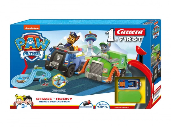 Circuit CARRERA FIRST Pat' Patrouille 2,4 m pour enfants dès 3 ans. Deux voitures, hélice tournante, contrôleurs, fabrication de qualité. Fonctionne avec 4× piles C.
