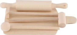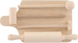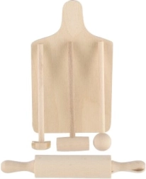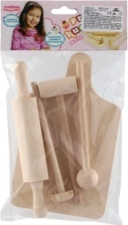 Le set est fabriqué en bois de qualité avec une surface lisse pour une utilisation confortable et sûre. Grâce aux éléments universels — planche, rouleau et pilon — les enfants imitent facilement la préparation des repas et apprennent les gestes culinaires de base.