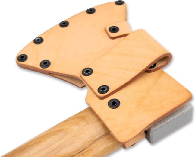 Les doubles sangles avec boutons-pression métalliques fixent la tête de la hache et la maintiennent en toute sécurité même en mouvement.