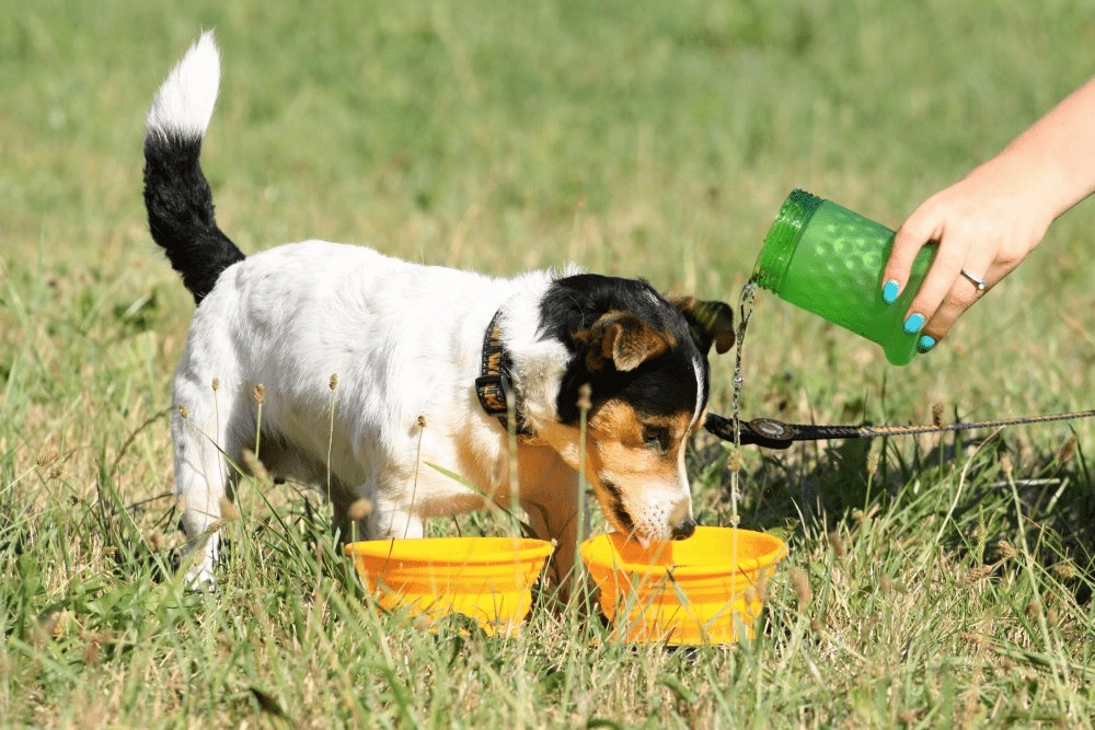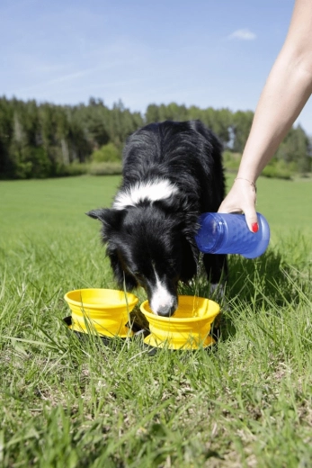 Solution compacte pour l’eau et la nourriture dans une seule bouteille. Idéale pour les promenades, les excursions et les voyages avec votre chien.