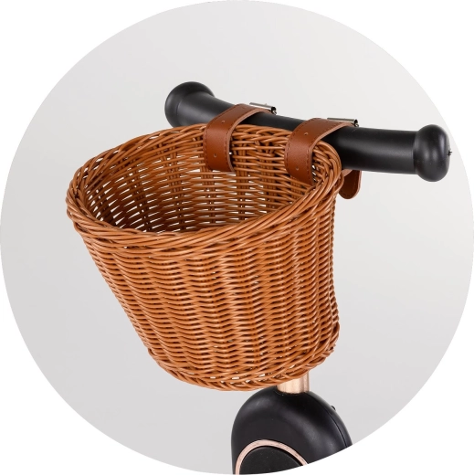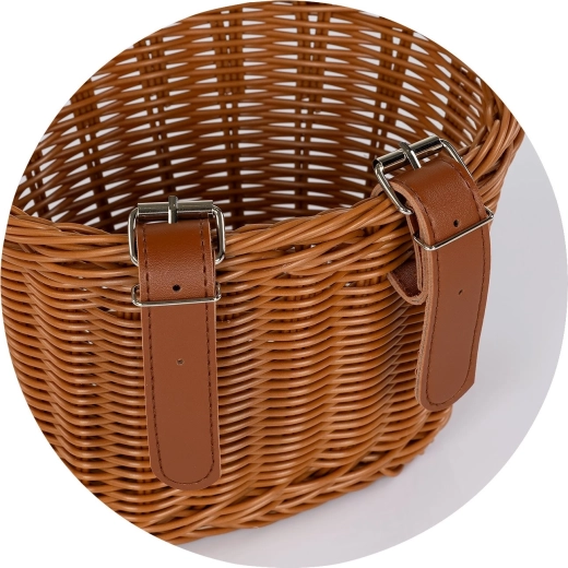 Panier en osier au style rétro pour vélos d’enfants, draisiennes et trottinettes. Offre une utilisation polyvalente, une fixation facile grâce à des sangles en cuir réglables et une construction robuste et légère au look naturel.