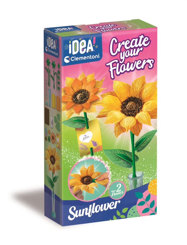 Découvrez le kit créatif de la gamme Idea Art, avec lequel les enfants créent facilement deux tournesols spectaculaires en papier crépon. Cette activité ludique développe la créativité, la motricité fine et la patience, apporte la joie du fait-main et offre la possibilité de préparer un cadeau original pour les proches. Fabriqué par la marque CLEMENTONI avec un souci de qualité et de sécurité.