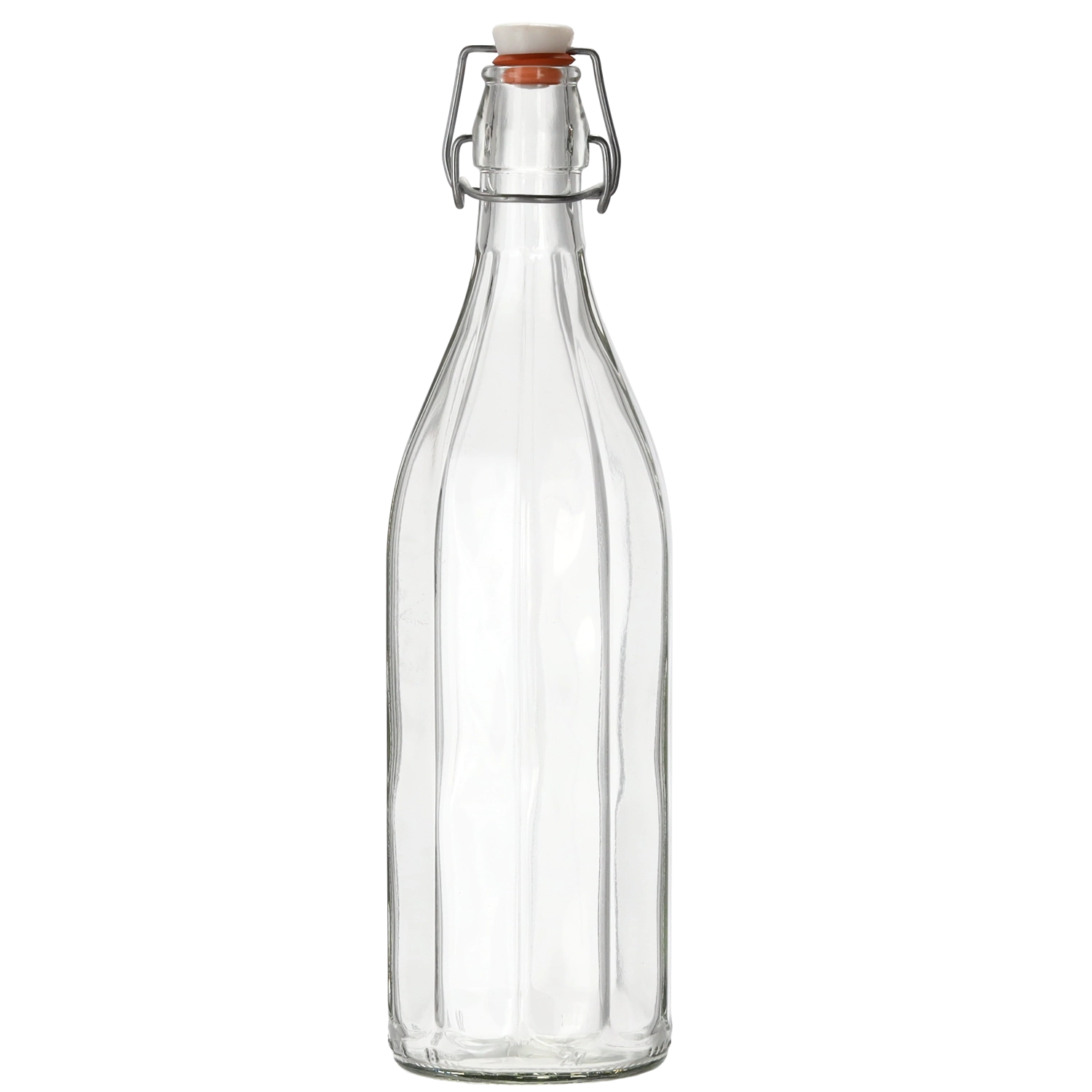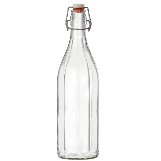 Élégante bouteille en verre Costolata de 1 l, idéale pour les jus maison, liqueurs, spiritueux et limonades. Elle offre une fermeture hermétique grâce à son bouchon mécanique à levier et se distingue par son verre transparent de qualité et son design rétro qui embellira aussi bien la cuisine que la table dressée.