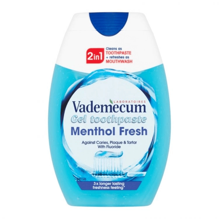 Vademecum 2en1 Menthol Fresh combine les avantages d’un dentifrice et d’un bain de bouche dans un seul produit. Il suffit de le mélanger avec de l’eau pour créer en un instant un bain de bouche efficace qui aide à éliminer les bactéries, rafraîchit l’haleine et favorise l’aspect sain des gencives. Grâce à sa fraîcheur mentholée, il procure jusqu’à trois fois plus longtemps une sensation de fraîcheur.