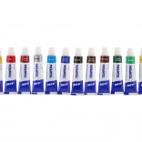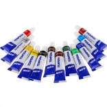 Le set comprend une sélection de 12 teintes populaires en tubes de 12 ml : bleu clair et bleu foncé, vert clair et vert foncé, jaune clair et jaune foncé, rouge clair et rouge foncé, brun clair et brun foncé, blanc et noir. Les tubes en aluminium avec bouchon à vis assurent un dosage précis et protègent la peinture du dessèchement.