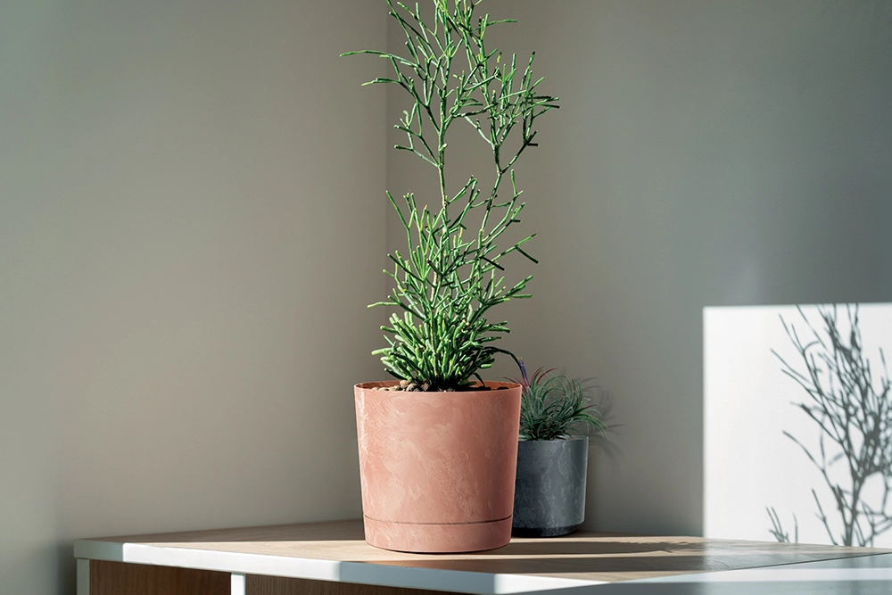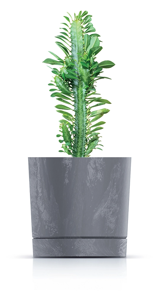 Le gris neutre et les lignes épurées se marient facilement avec le mobilier et la décoration. Le cache-pot devient une décoration discrète mais marquante sur une étagère ou une table.