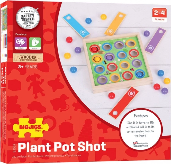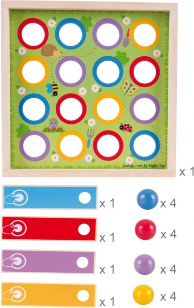 Un jeu familial amusant pour les enfants dès 3 ans qui développe la motricité fine, l’observation et la coordination œil–main. Le but est d’envoyer, à l’aide de lanceurs, des billes colorées dans les trous correspondants du plateau. Jeu pour 2 à 4 joueurs en rouge, bleu, jaune et violet. Fabriqué en bois issu de sources responsables et conforme aux normes de sécurité européennes.