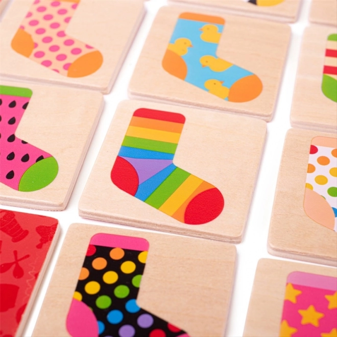 Enrichissez les moments de jeu avec vos enfants grâce au pexeso en bois avec chaussettes. Ce jeu stimule la mémoire et favorise la concentration ainsi que le développement des compétences stratégiques. Tout ce que vous avez à faire est de disposer les 32 pièces en bois face cachée et commencer à retourner deux pièces à la fois. La difficulté augmentant progressivement, le joueur tente d'associer les paires de chaussettes et d'adopter de nouvelles stratégies.