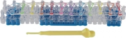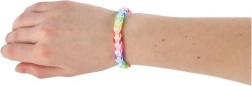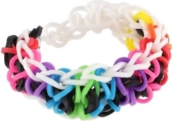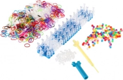 env. 700 élastiques en silicone de différentes couleurs, métier à tisser à trois rangées, crochet, outil d’enfilage, 20 fermoirs, perles colorées, guide illustré