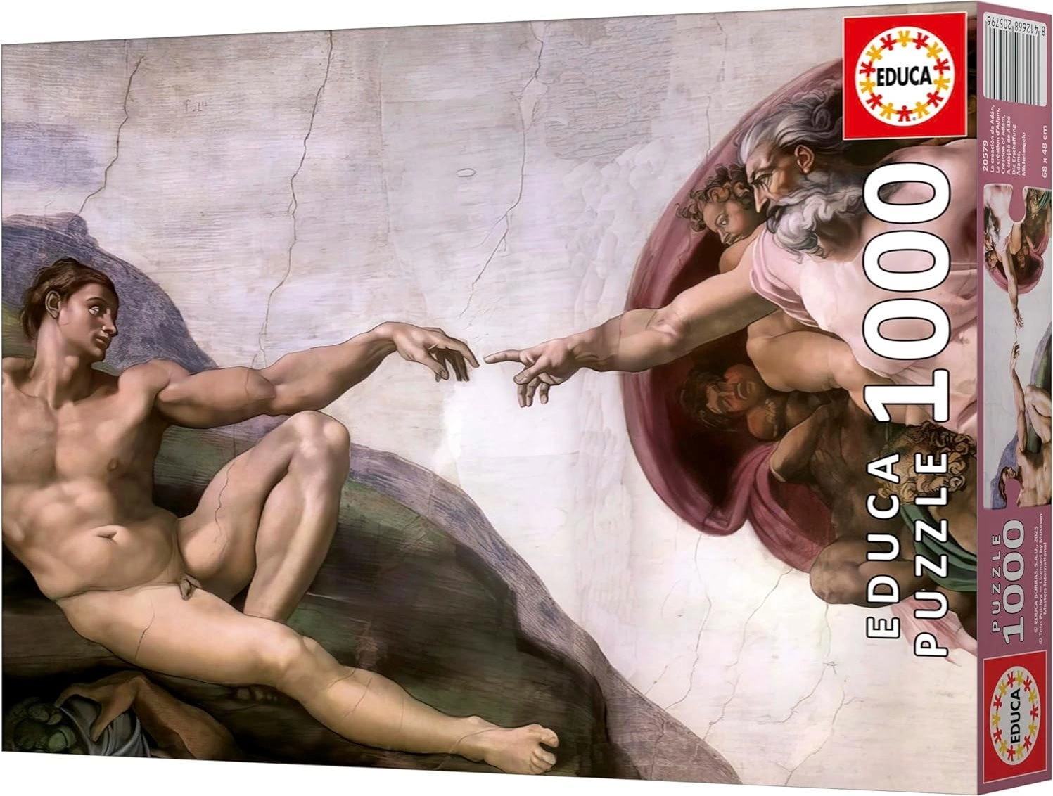 Profitez d’heures de détente avec le puzzle de qualité EDUCA représentant la célèbre œuvre La Création d’Adam. L’emballage contient 1000 pièces, de la colle offerte pour une fixation finale, et une fois assemblé le puzzle mesure env. 68 × 48 cm.
