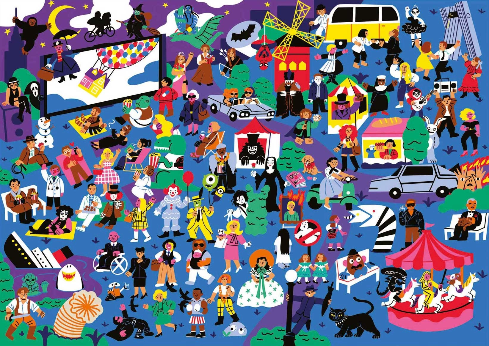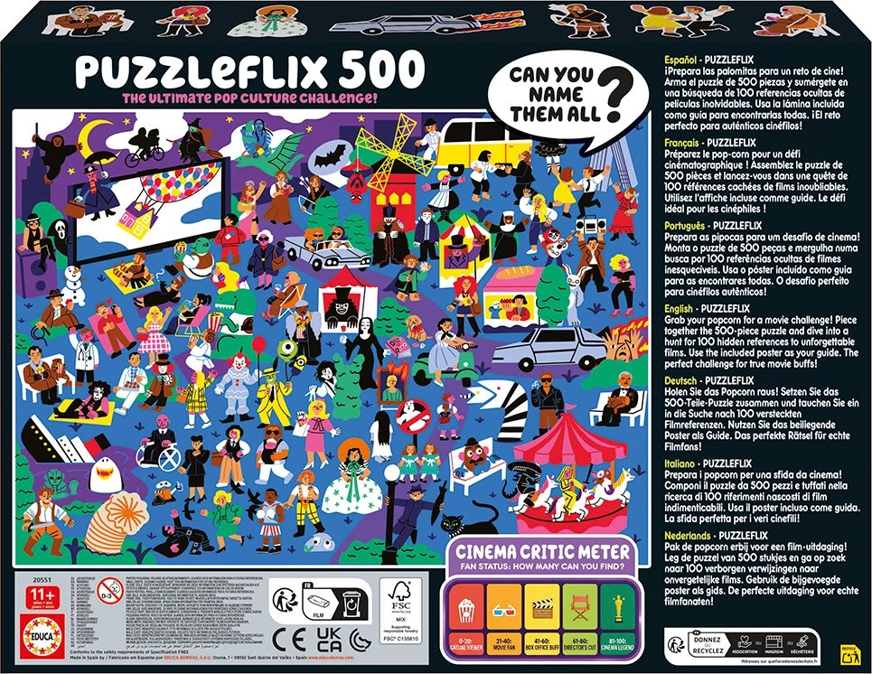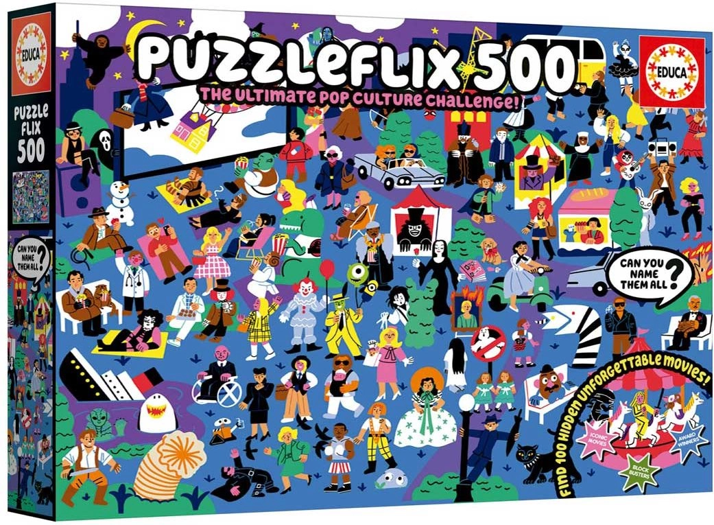 Découvrez le monde du cinéma en assemblant l’original puzzle EDUCA Puzzleflix. L’illustration renferme 100 clins d’œil à des films inoubliables, pour ravir aussi bien les fans chevronnés que les amateurs d’énigmes. Le poster inclus vous sert d’aide et de guide afin de ne manquer aucun détail.
