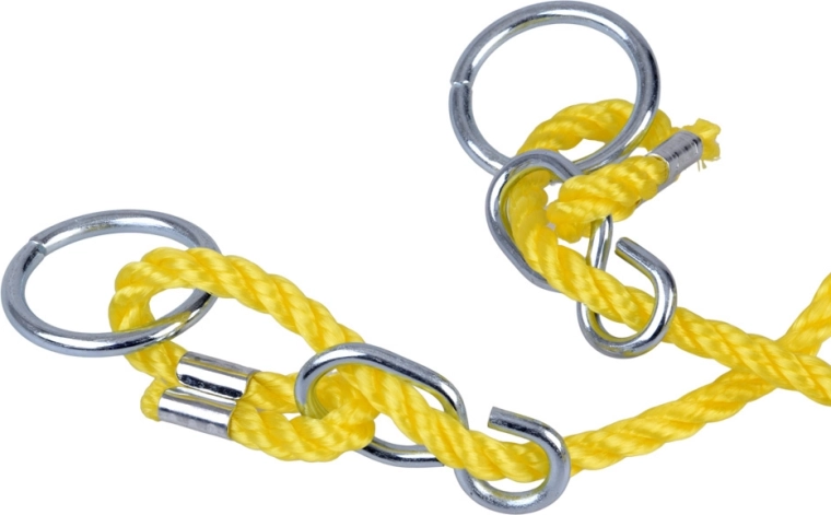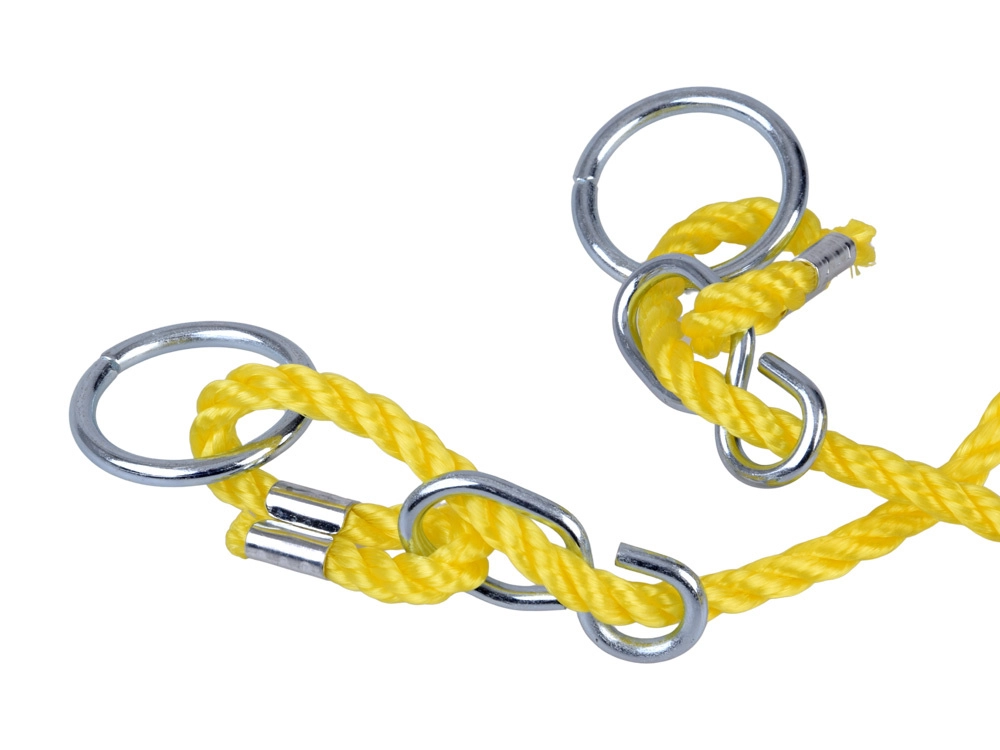 Des cordes jaunes épaisses avec boucles en plastique permettent un réglage facile de la longueur et un alignement précis de la balançoire. Les anneaux et crochets métalliques accélèrent le montage.