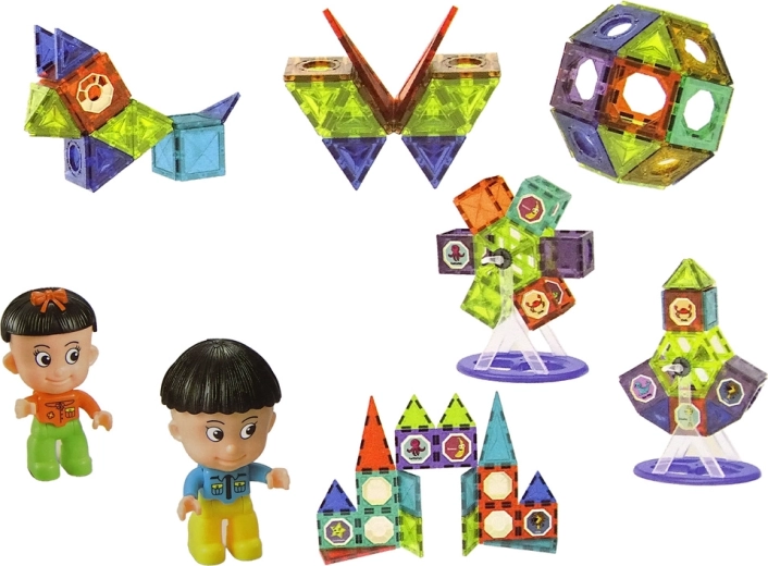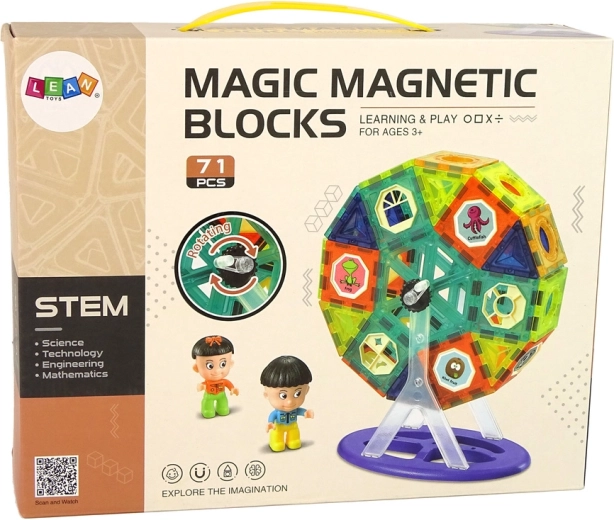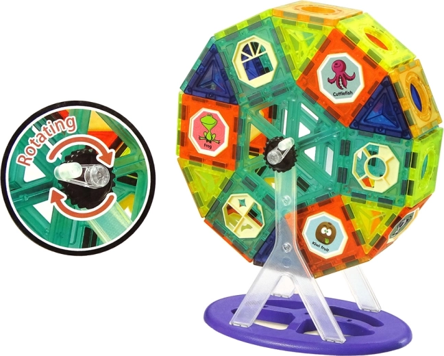 Ce set complet comprend 71 pièces, dont une base spéciale avec poignée rotative pour construire une grande roue ou un manège. Le kit inclut également des autocollants avec des animaux, des fruits et des légumes, qui apportent une touche ludique aux constructions, ainsi que deux figurines pour un jeu encore plus amusant. Grâce à des aimants puissants et des connexions fiables, vous obtenez des structures 3D stables qui captiveront les enfants pendant des heures.
