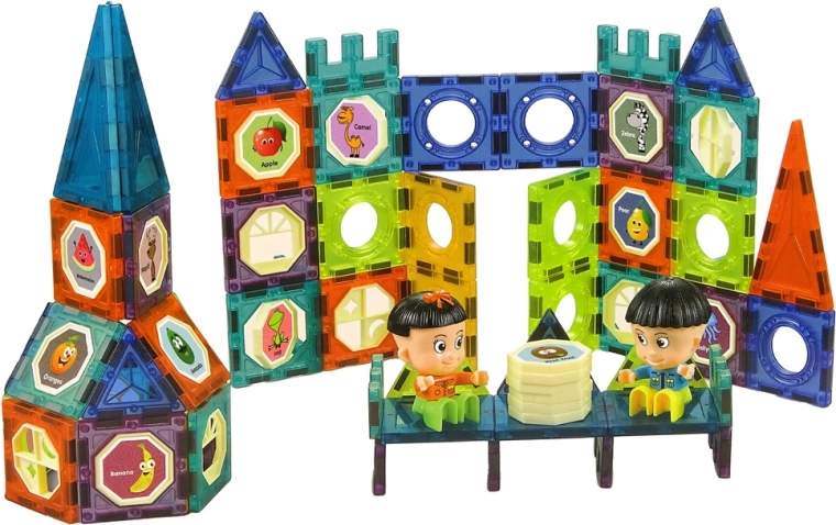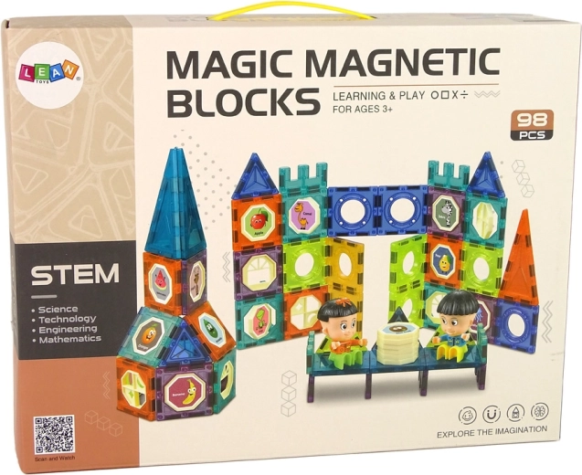 Découvrez un univers créatif avec un jeu de construction magnétique de 98 pièces, permettant d’assembler des constructions 3D comme un château ou une grande roue. Stimule la motricité fine, la logique et la créativité. Les pièces avec aimants et clips se connectent et se séparent facilement. Inclus : autocollants avec animaux, fruits et légumes, 2 personnages et un manual. Matériaux sûrs et durables, certification CE, convient dès 3 ans.