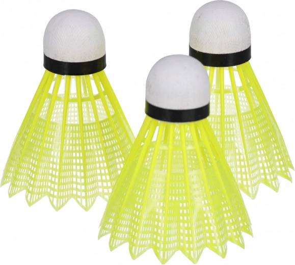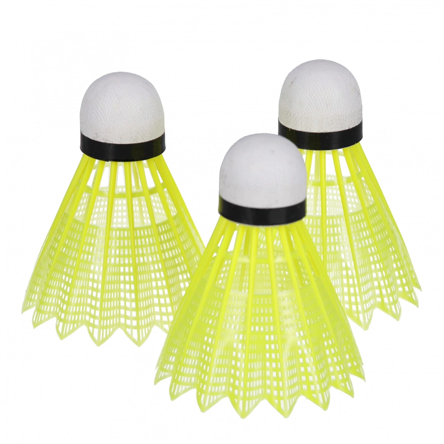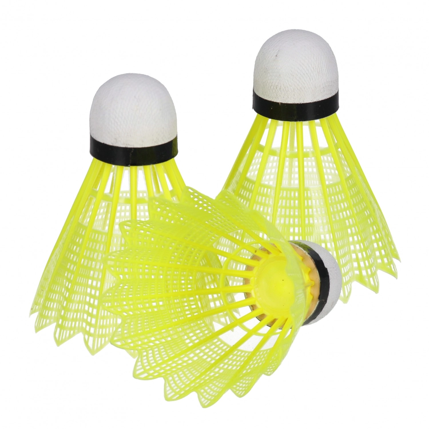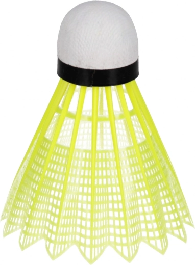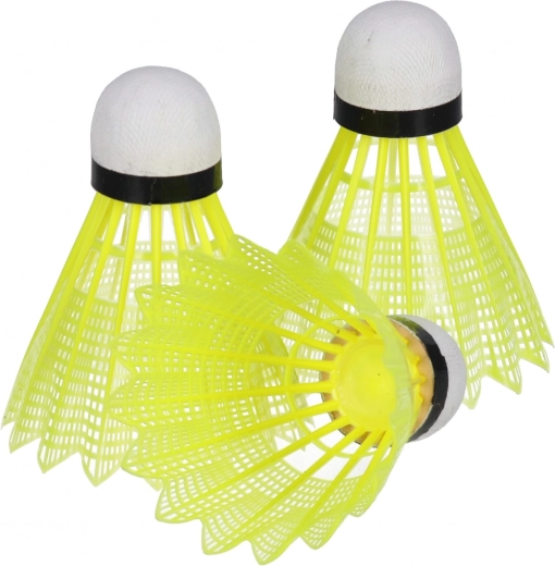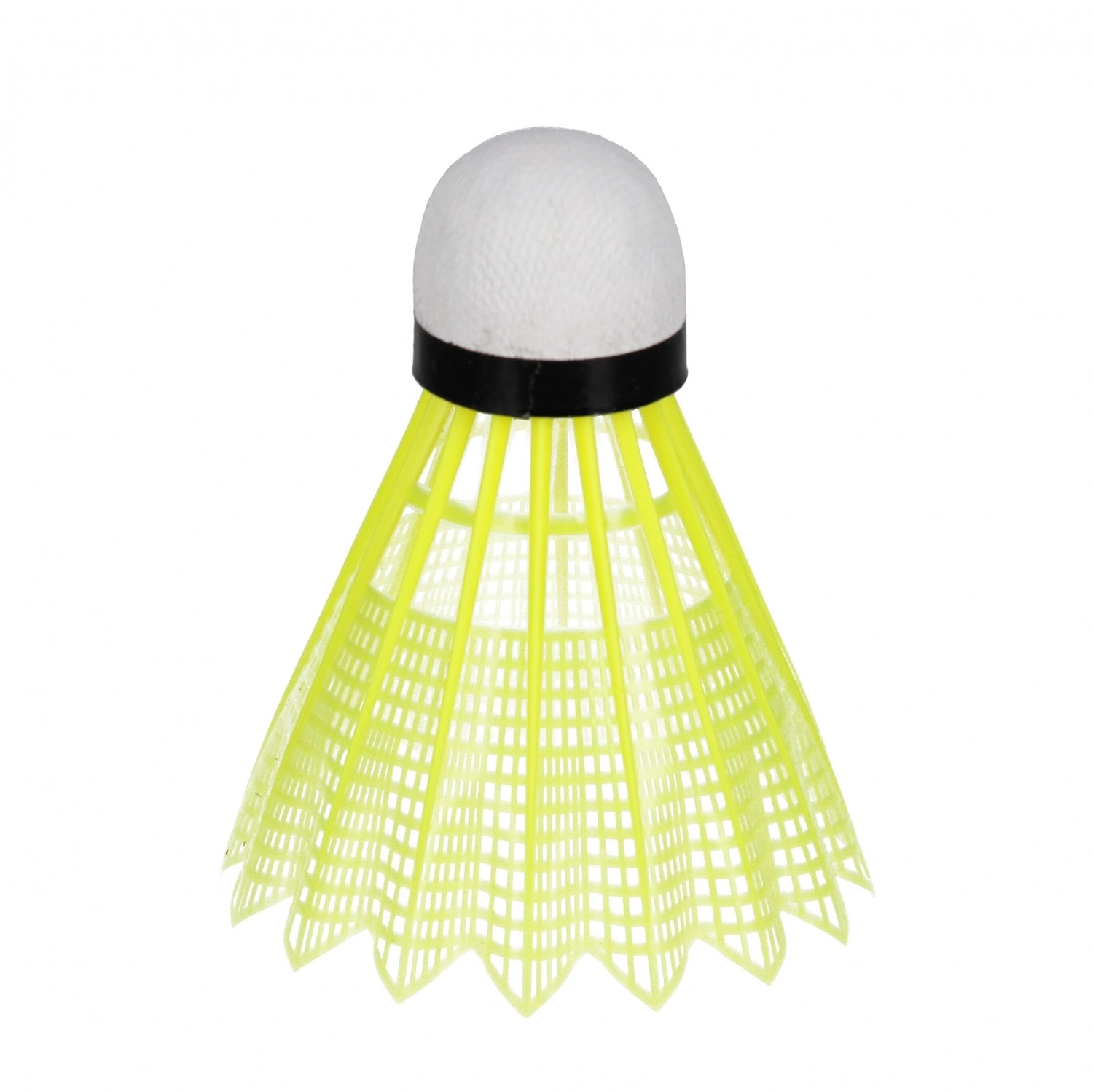 Ce set de volants de badminton est conçu pour un jeu récréatif détendu. Les volants en plastique jaune vif avec tête blanche et bande noire sont bien visibles dans différentes conditions de luminosité et, grâce à leur construction résistante, supportent des frappes répétées.
