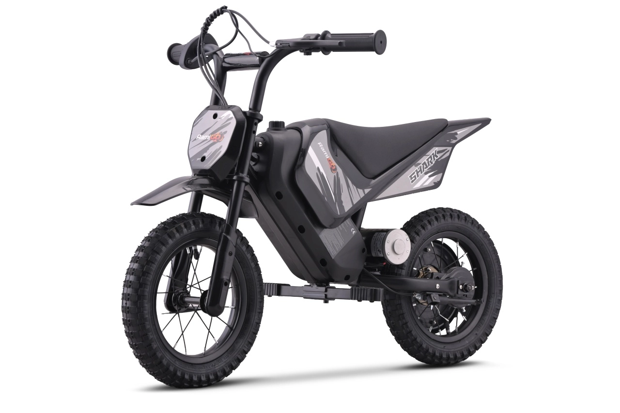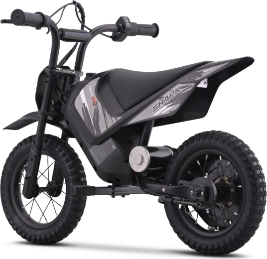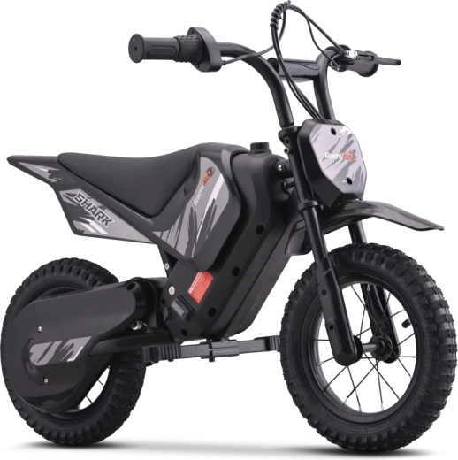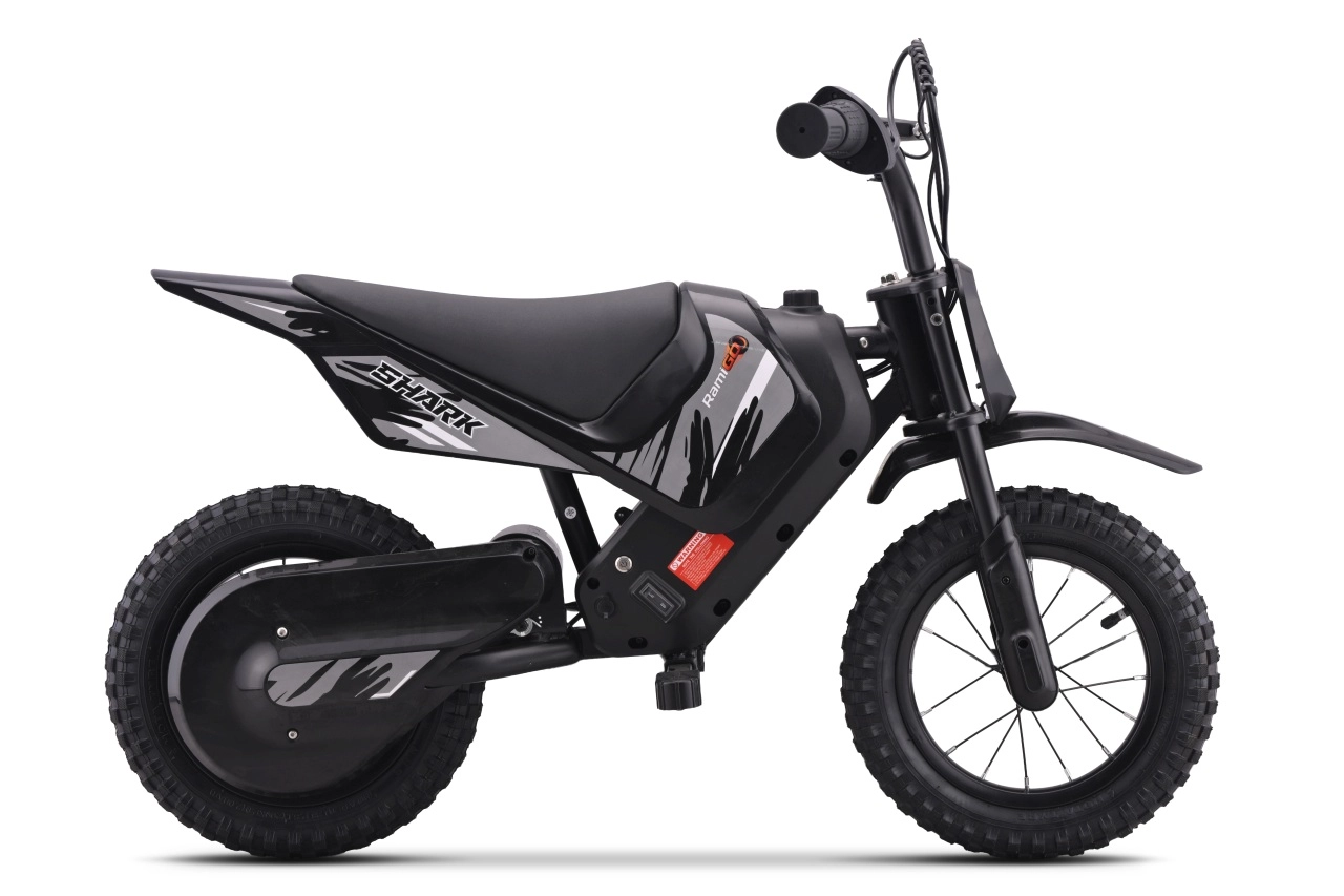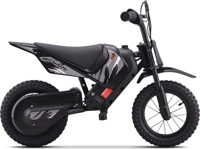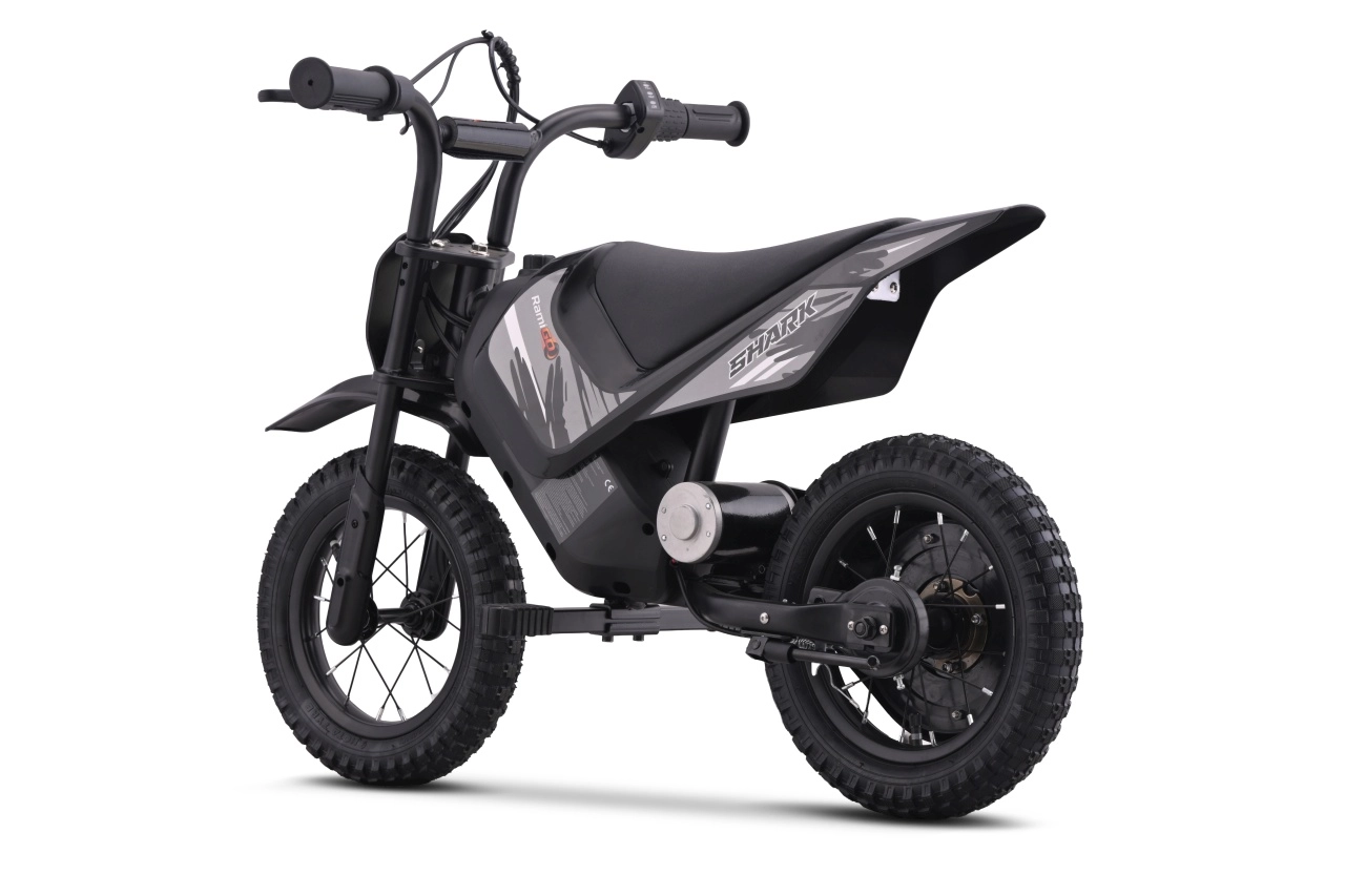 La moto électrique compacte pour enfants SHARK en élégant coloris noir offre un moteur électrique silencieux de 150 W, deux vitesses au choix et des pneus tout-terrain gonflables pour une adhérence sûre hors route. Grâce à son cadre en acier robuste avec peinture époxy, son bras oscillant arrière renforcé et son indicateur d’état de la batterie, c’est un choix idéal pour les premières expériences off-road en toute sécurité.