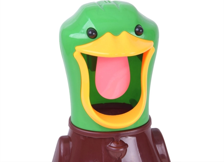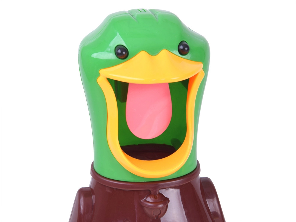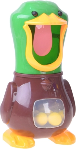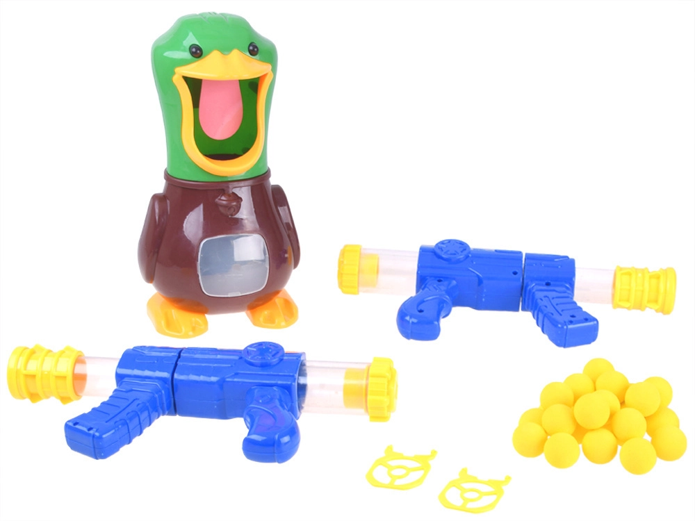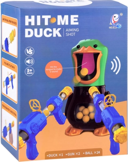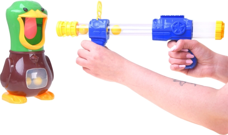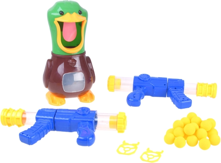 Amusant jeu de tir de table avec un canard, dans le bec grand ouvert duquel vous tirez des ballettes souples en mousse à l’aide de 2 blasters à pompe. Un jeu sûr pour enfants et adultes qui développe réflexes, concentration et précision. Lorsque la cible est touchée, le canard émet un coin-coin et son palais rétroéclairé est mieux visible comme cible. Le ventre transparent du canard collecte et stocke les balles en toute simplicité.