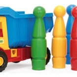 Camion benne Multi Truck avec une benne mobile offre du divertissement pour nos petits enfants. Inclus est un ensemble de quilles avec 5 quilles colorées et une boule.