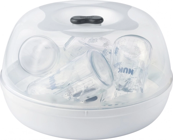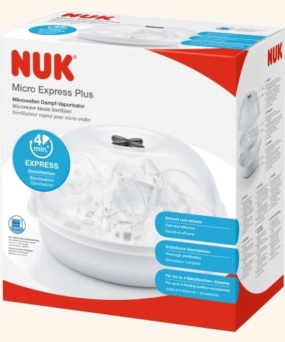 NUK Micro Express Plus est un stérilisateur vapeur pour four à micro-ondes qui assure une désinfection fiable des biberons et accessoires en quelques minutes. Grâce à son support intelligent, il accueille jusqu’à 4 biberons de 300 ml à large goulot et les maintient dans la bonne position pour un séchage efficace. Le couvercle transparent et le nouveau système de verrouillage garantissent une utilisation sûre et claire.