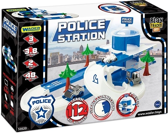 La station de police Wader Play Tracks City offre aux enfants dès 1 an des aventures dynamiques sur un circuit multi-niveaux de 3,8 m. Inclus : une station à deux niveaux, 3 petites voitures de police Kid Cars (voiture de police, fourgonnette, 4x4) et des éléments décoratifs avec autocollants. Grâce au montage facile et au plastique sûr et résistant, elle stimule l'imagination et la motricité fine, et fait un superbe cadeau.
