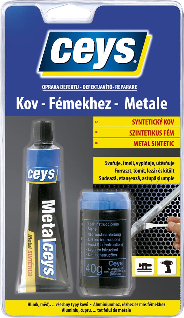Mastic CEYS bicomposant avec charge métallique pour des réparations rapides et durables des métaux. Soudure à froid (p. ex. aluminium, cuivre), colmate, assemble et comble les fissures. Forme un film anticorrosion, est résistant aux acides, détergents et minéraux et, après durcissement, peut être poncé, percé, poli et peint.