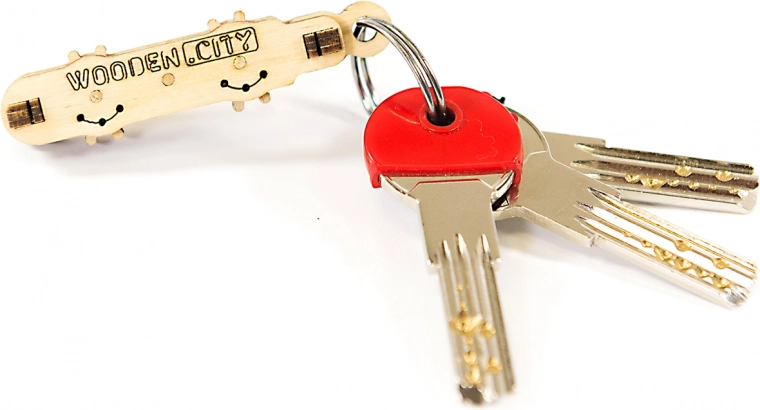 Porte-clés léger en bois avec trou pour anneau – faites tourner une roue et l’autre s’anime toute seule. Un accessoire stylé pour clés ou sac à dos.