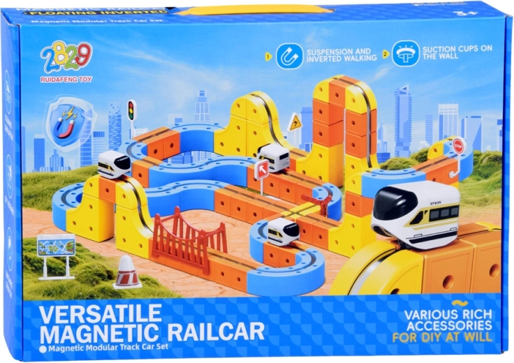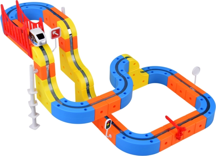 Le circuit modulaire magnétique offre aux enfants une expérience de conduite unique – le véhicule magnétique reste sur les rails même retourné et traverse en douceur les ponts, virages et rampes. Grâce aux connecteurs magnétiques, vous construisez des structures stables en un rien de temps, que ce soit au sol, sur une table ou à l’aide de ventouses au mur.