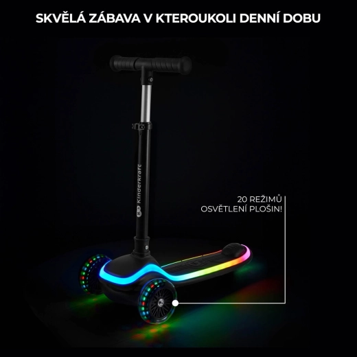 Jusqu’à 20 modes lumineux sur la plateforme et des roues lumineuses garantissent que l’enfant reste bien visible même à la tombée de la nuit – et la conduite devient encore plus ludique.