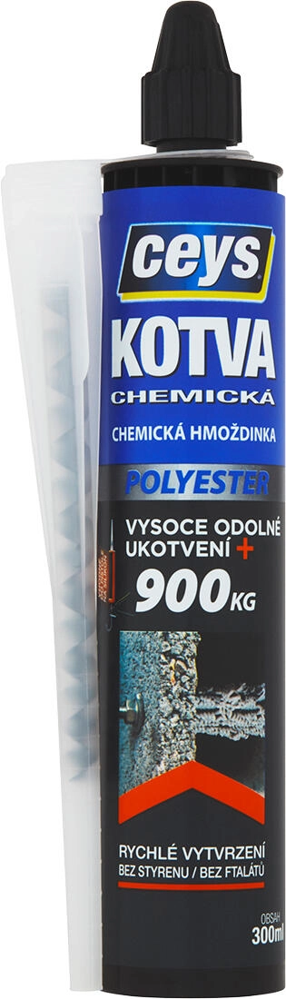 CEYS Ancrage chimique polyester 300 ml est un mastic bicomposant à prise rapide pour un ancrage extrêmement solide et sécurisé dans des matériaux creux et pleins. Grâce à l’absence d’expansion, il convient aux montages où il existe un risque de fissuration du support et permet l’ancrage à proximité des arêtes.