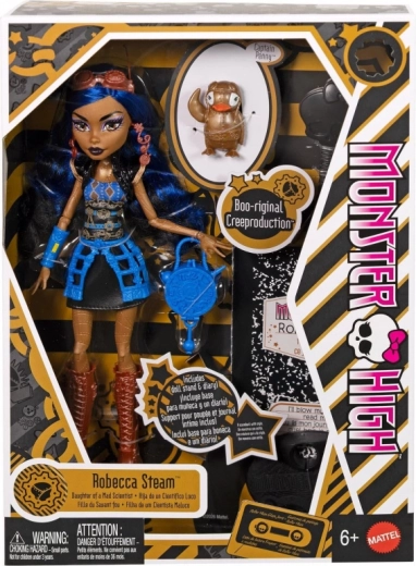 L’héroïne appréciée de MONSTER HIGH revient dans une réédition Creeproduction qui rend hommage à la première génération. Robecca séduit par son teint bronze, son maquillage marqué et ses cheveux bleu‑noir. Sa tenue aux motifs d’engrenages, sa jupe aux accents métalliques, ses hautes bottes « fusées » et ses lunettes cuivrées incarnent l’essence du style steampunk.
