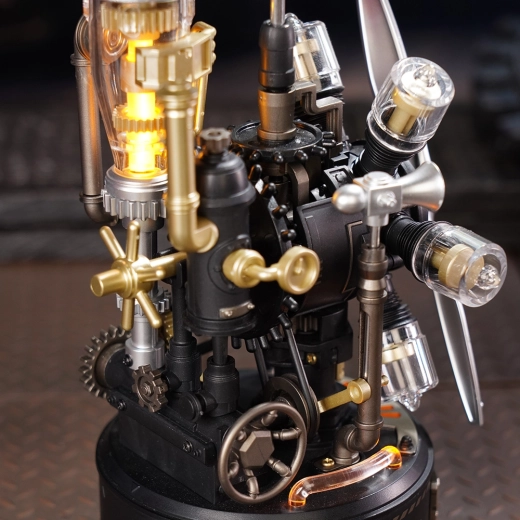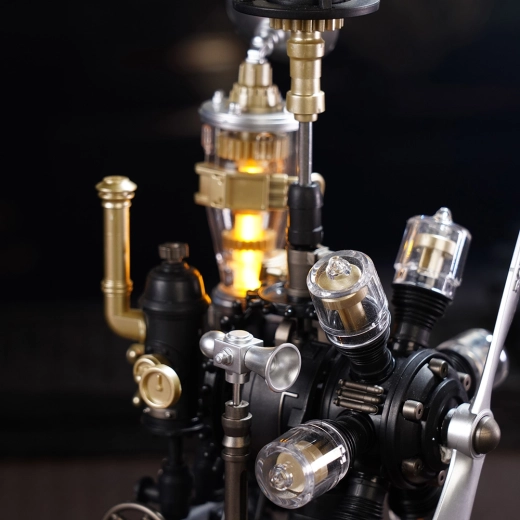 La LED intégrée et la simulation de vapeur renforcent l’atmosphère steampunk. Le modèle devient une décoration marquante à la maison comme au bureau.