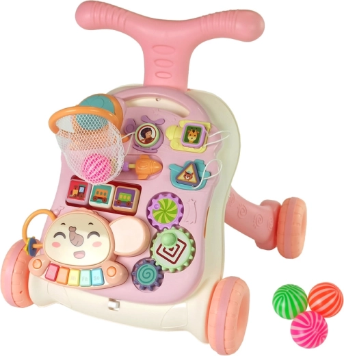 Le trotteur interactif et table de jeu 2-en-1 rose accompagne les premiers pas tout en stimulant les sens et la motricité fine. Il propose un panneau éducatif amovible avec piano, engrenages, formes, panier à balles et cubes rotatifs. Grâce à la possibilité de bloquer les roues arrière et de lester le réservoir avec de l’eau, le jeu est sûr et stable. Le panneau peut être déclipsé et utilisé séparément à la maison comme en déplacement.
