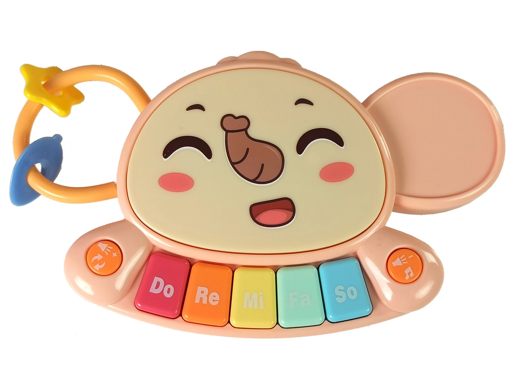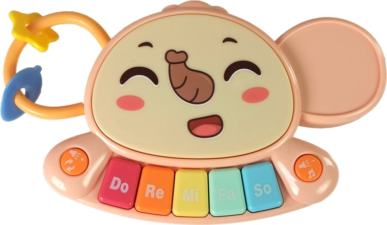 - piano coloré (Do–Ré–Mi–Fa–Sol), 3 engrenages, formes géométriques sur cordelettes, panier et balles, cubes rotatifs