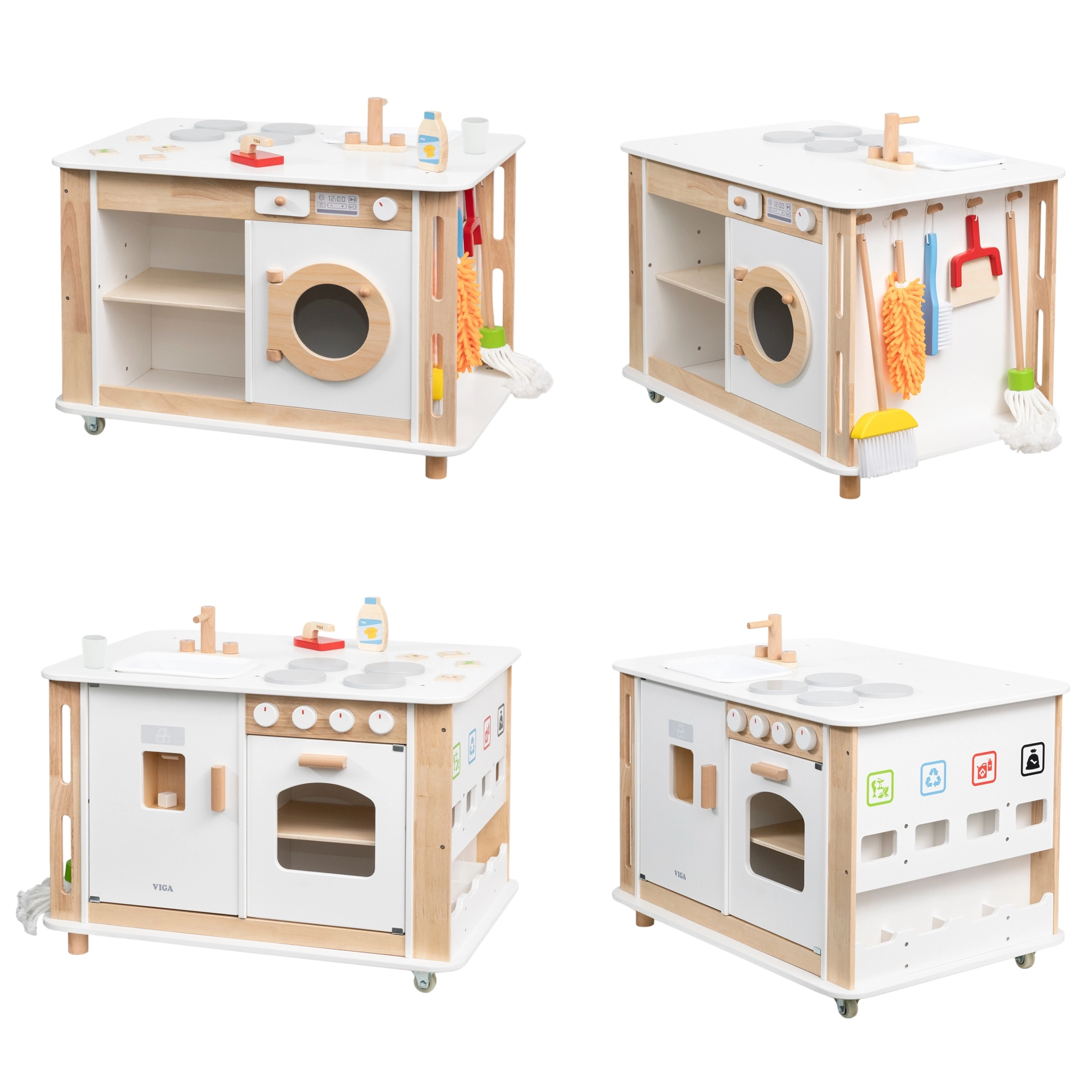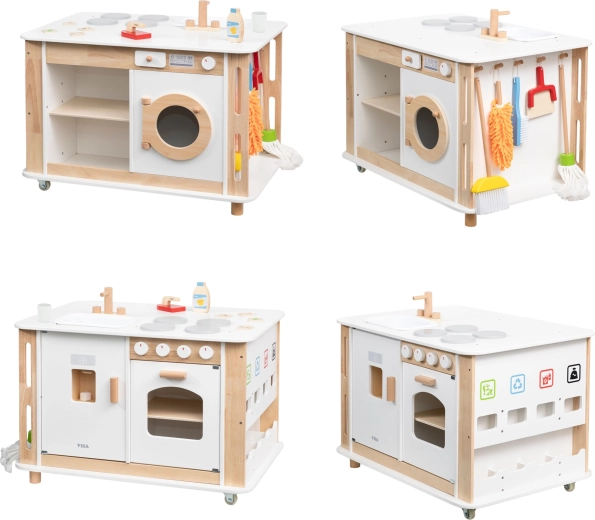 Des détails réalistes et de nombreux accessoires (ustensiles de cuisine, aliments, « produits de nettoyage », fer et planche à repasser, ensemble d’outils de ménage) stimulent l’imagination et développent des compétences pratiques. La conception en îlot favorise l’interaction simultanée de plusieurs enfants et les initie à la coopération, à l’organisation et à l’écocitoyenneté.