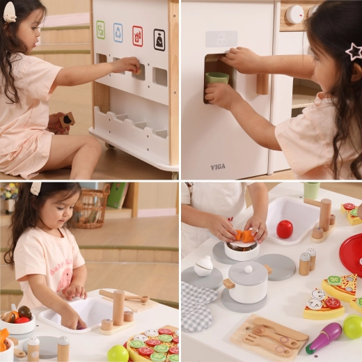 Ce centre domestique en bois 3‑en‑1 Viga transforme la chambre des enfants en un environnement vivant plein d’imitations des tâches quotidiennes. Les enfants peuvent cuisiner sur la plaque avec boutons de commande, cuire au four, « laver le linge » dans la « machine », faire la vaisselle dans l’évier et apprendre à trier les déchets à l’aide d’éléments colorés. Grâce aux deux roulettes pivotantes, toute la station se déplace facilement et convient parfaitement au jeu partagé.