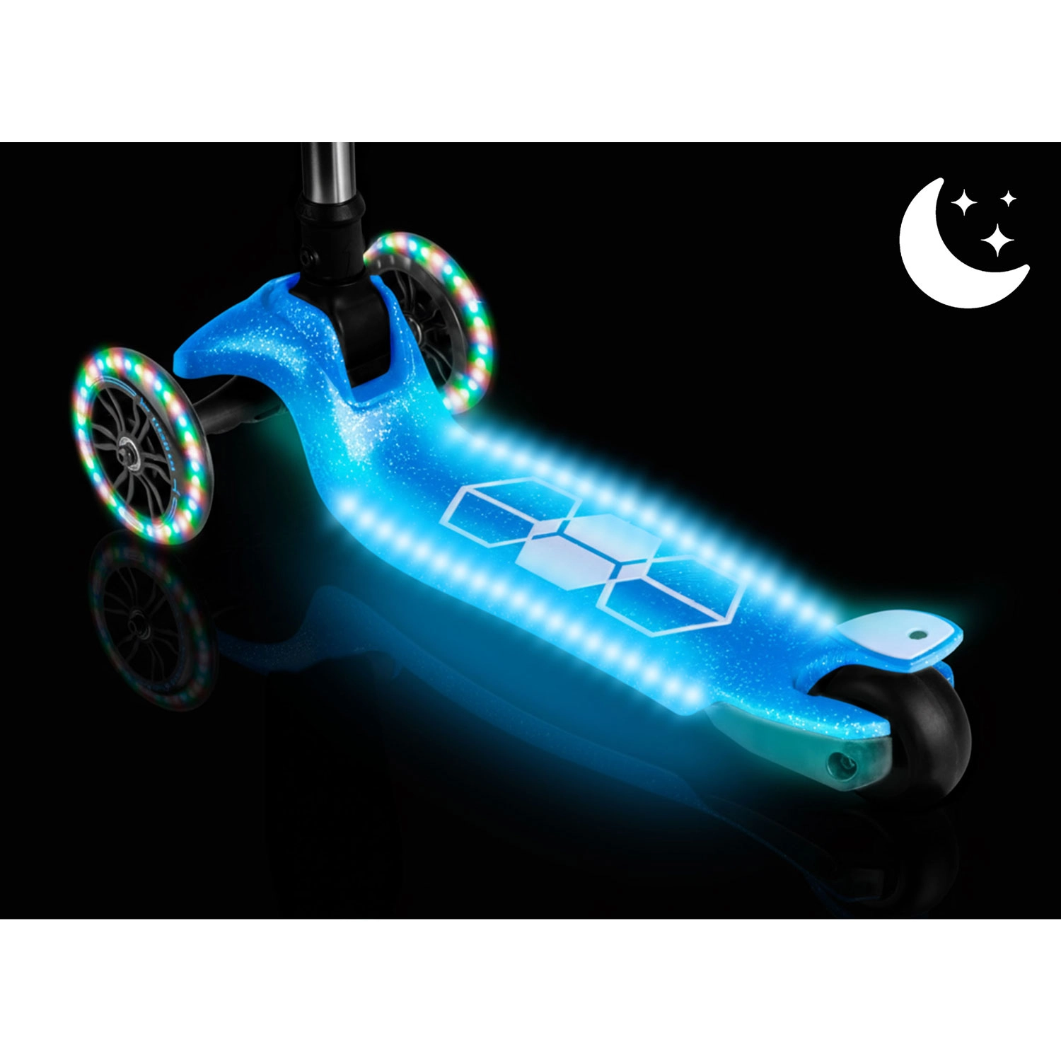 Une dynamo intégrée éclaire les roulettes avant et les bandes LED du plateau. Meilleure visibilité et look attrayant à chaque sortie.