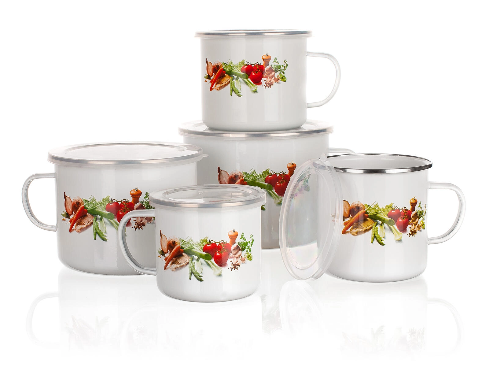 Ce mug émaillé au revêtement blanc et au motif de légumes joyeux séduit par sa résistance, sa légèreté et son entretien facile. Le couvercle en plastique pratique aide à garder la boisson chaude plus longtemps, protège le contenu lors du transport et convient également pour une conservation de courte durée de boissons ou de plats.