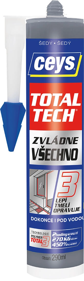 Colle et mastic universels CEYS TOTAL TECH, couleur grise, 290 ml, offrant une adhérence initiale immédiate, un joint étanche et hydrofuge et une adhérence maximale sur la plupart des matériaux. Le polymère hybride combine la adhérence du polyuréthane avec l’élasticité du silicone, convient à l’intérieur comme à l’extérieur et fonctionne même sous l’eau.