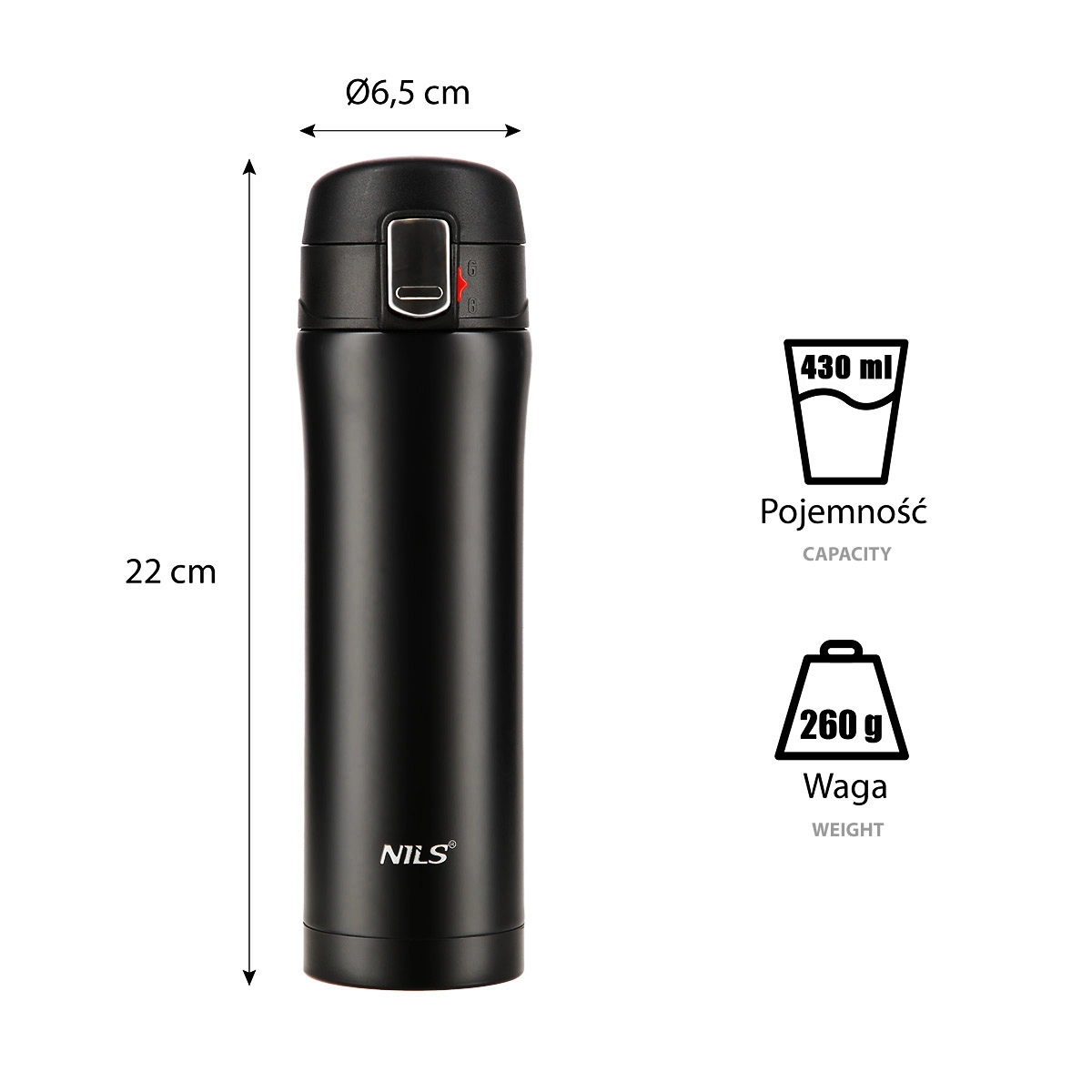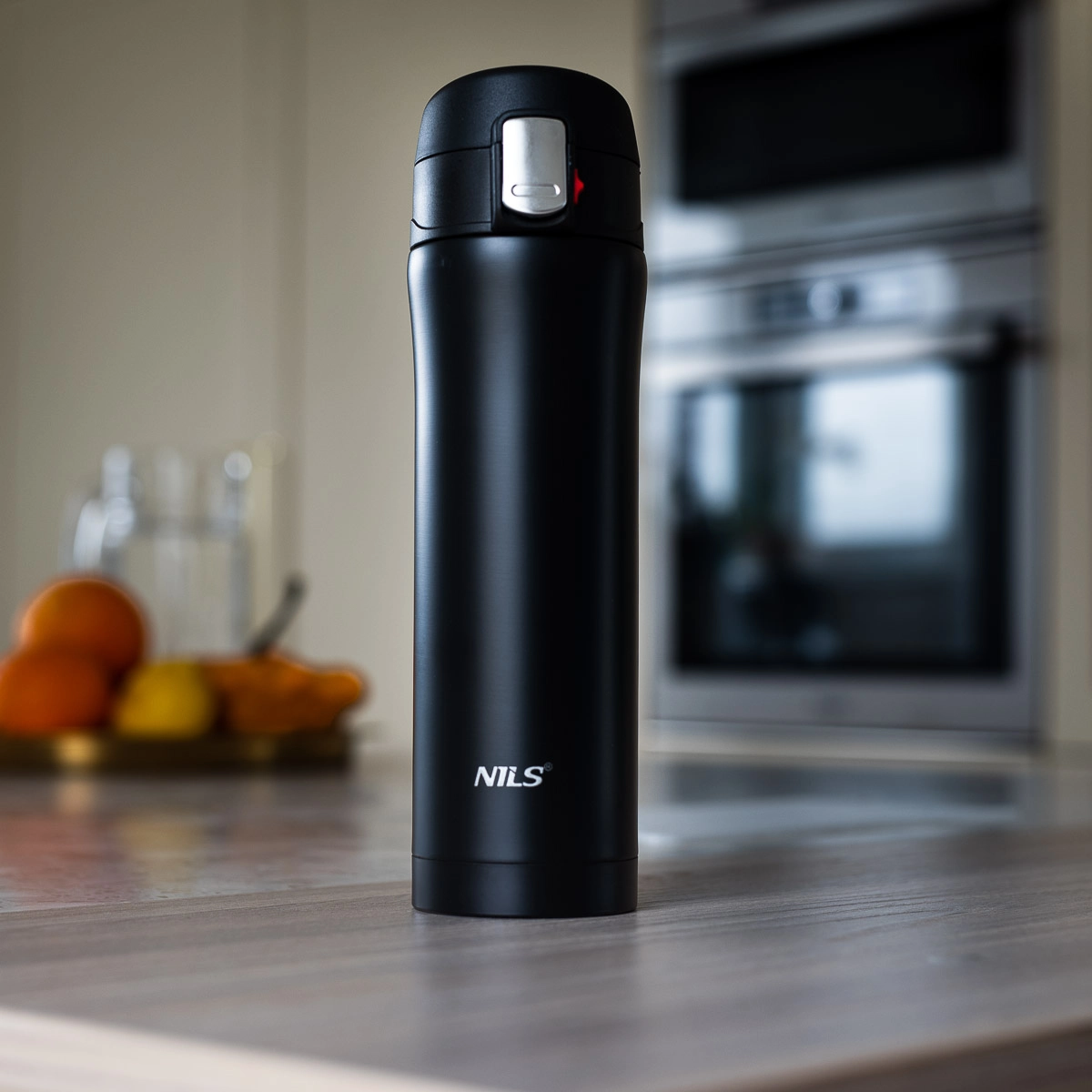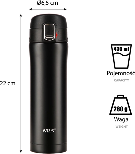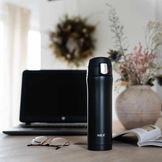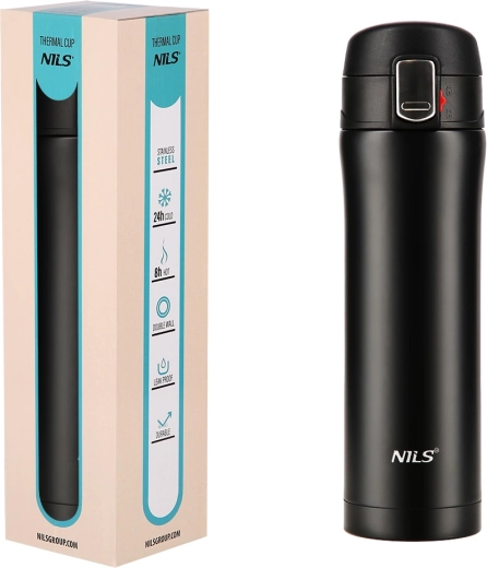 Élégant thermos de voyage NILS Camp d’une capacité de 430 ml en acier inoxydable résistant avec double paroi sous vide, qui garde les boissons chaudes jusqu’à 12 heures et froides jusqu’à 24 heures. Le couvercle avec verrou de sécurité et bouton d’ouverture facile empêche les fuites, idéal pour le bureau, la voiture et les excursions.
