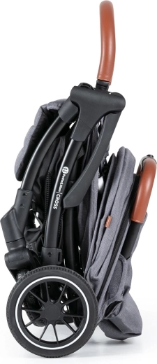 La poussette se déplie d’une seule main et, après usage, se replie automatiquement en un format compact; une fois pliée, elle tient debout seule. Idéale pour la ville, les transports en commun et la voiture.