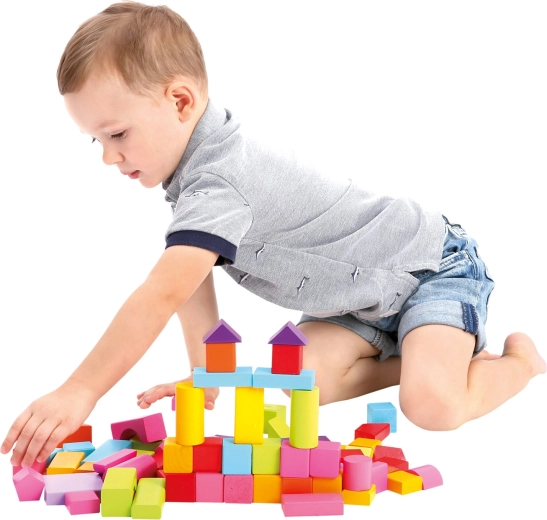 Idéal dès 1 an : les blocs ont une surface agréablement lisse, des couleurs vives et sûres, et une grande variété de formes — des cubes et pavés aux cylindres, en passant par les arches et les triangles. Jouer avec les blocs favorise le développement de la perception spatiale, de la créativité et de la coordination œil-main.